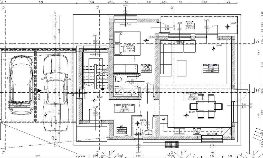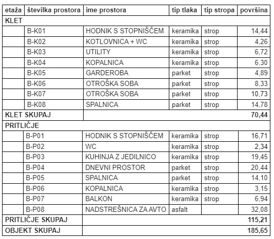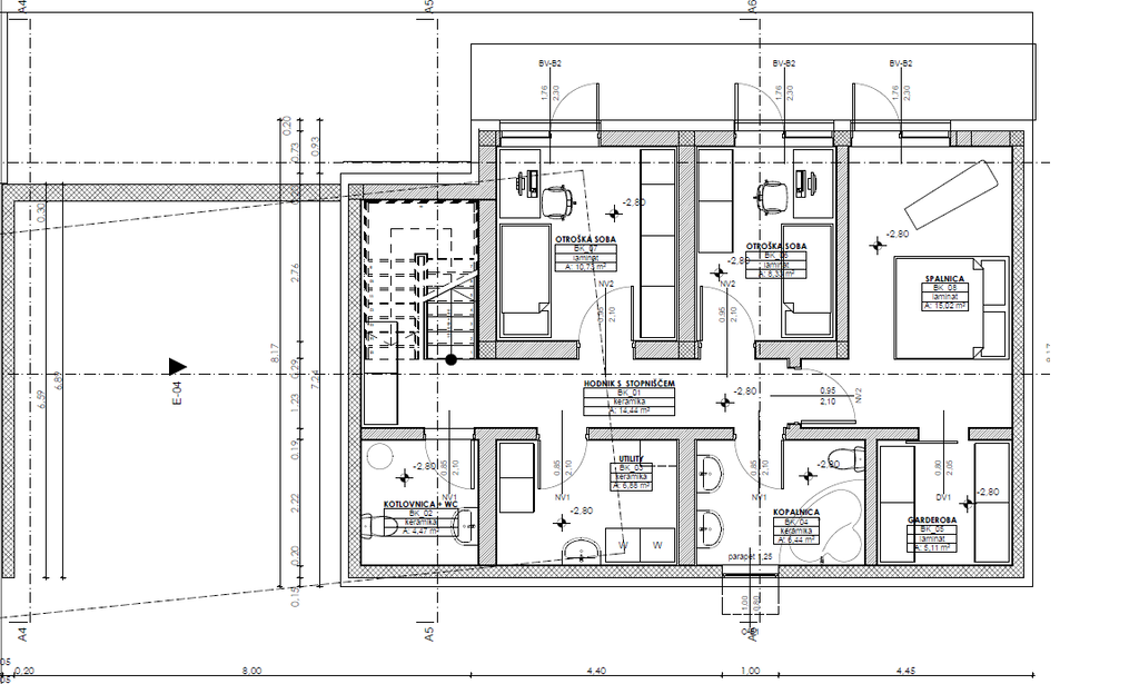 1. Etaža: hodnik, kotlovnica, WC, utility, kopalnica, garderoba, 2 otroški sobi, spalnica