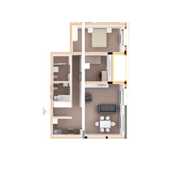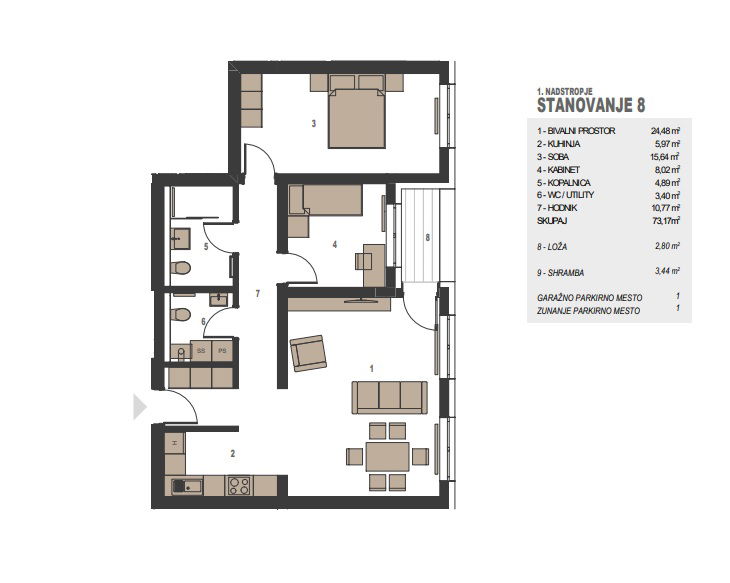 Stanovanje z odlično razporeditvijo prostorov obsega: