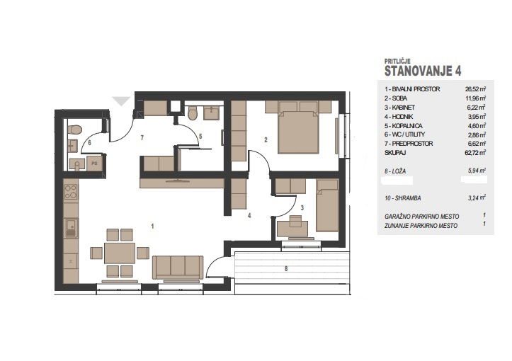 • Parkirna mesta: ob kletnih shrambah z priključkom za elektriko (opcija: doplačilo za izvedbo inštalacije za polnilnico).